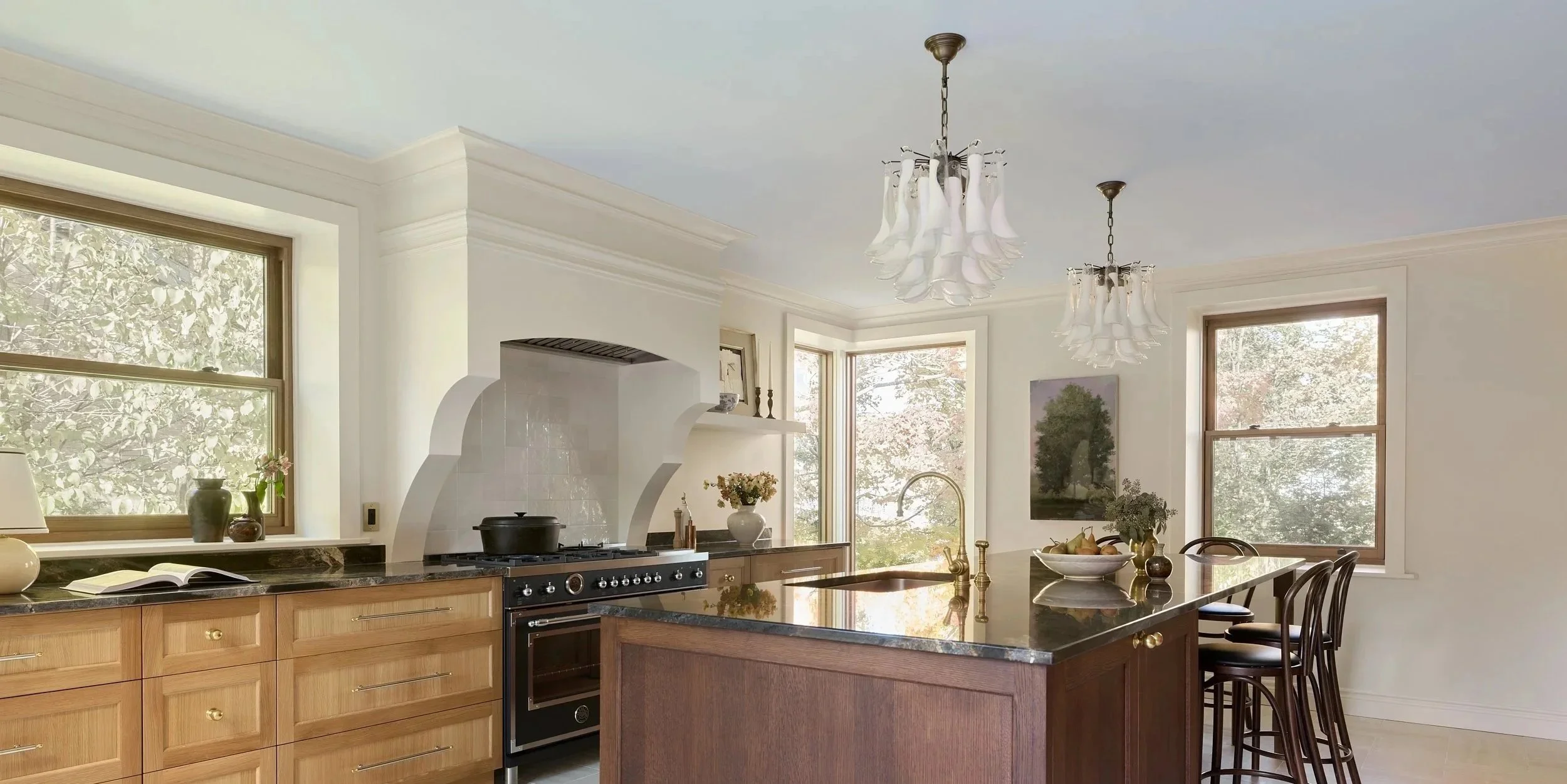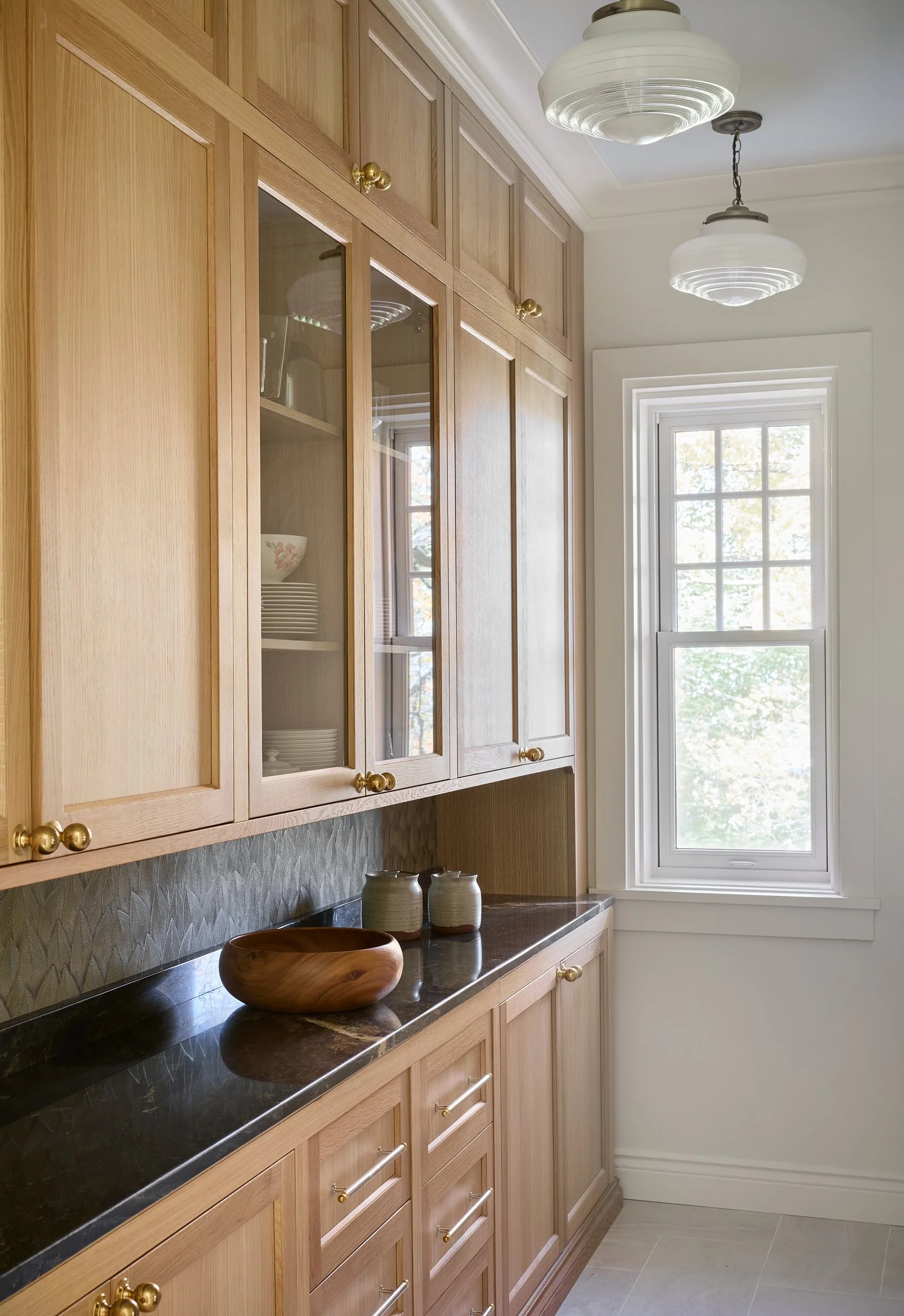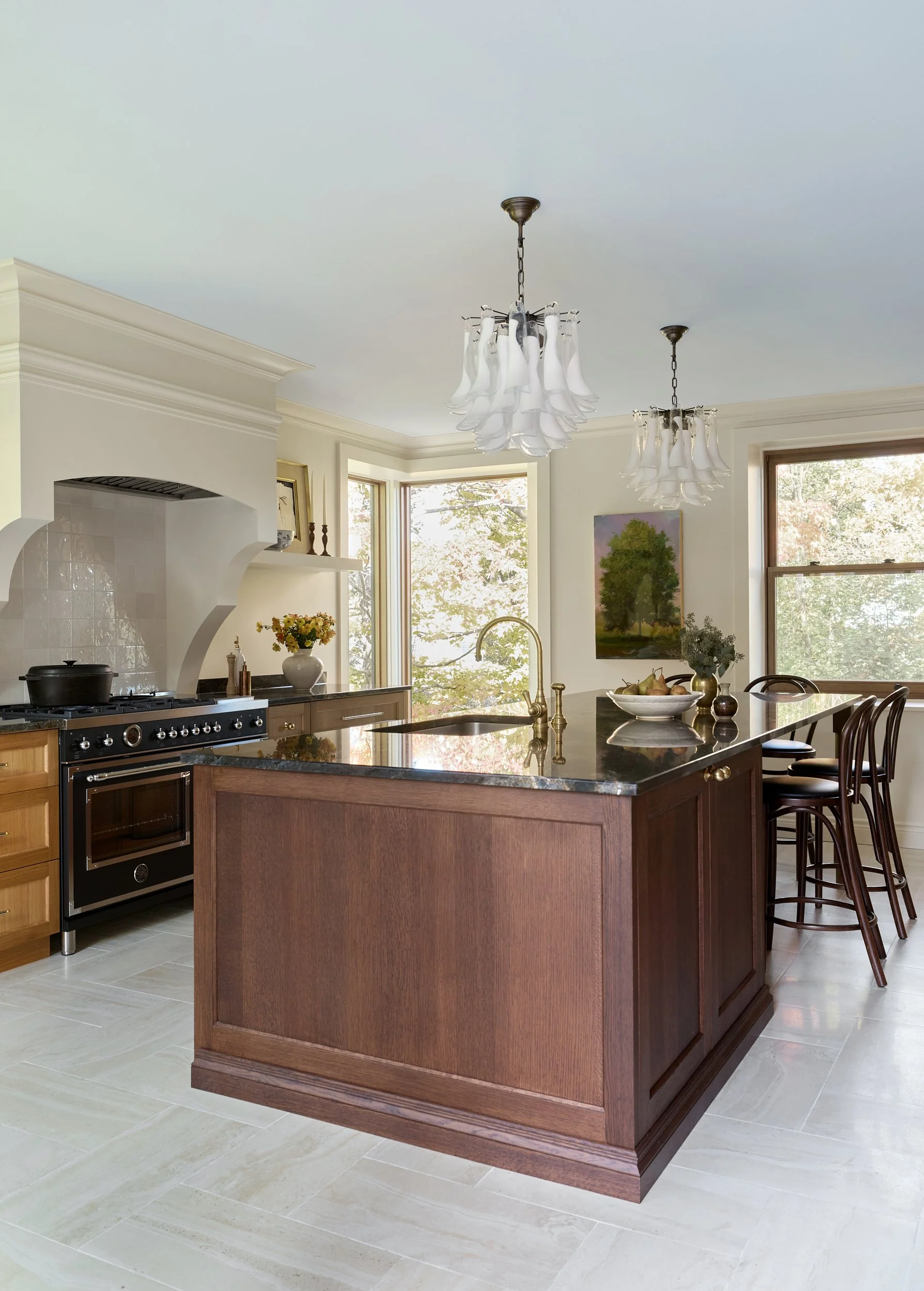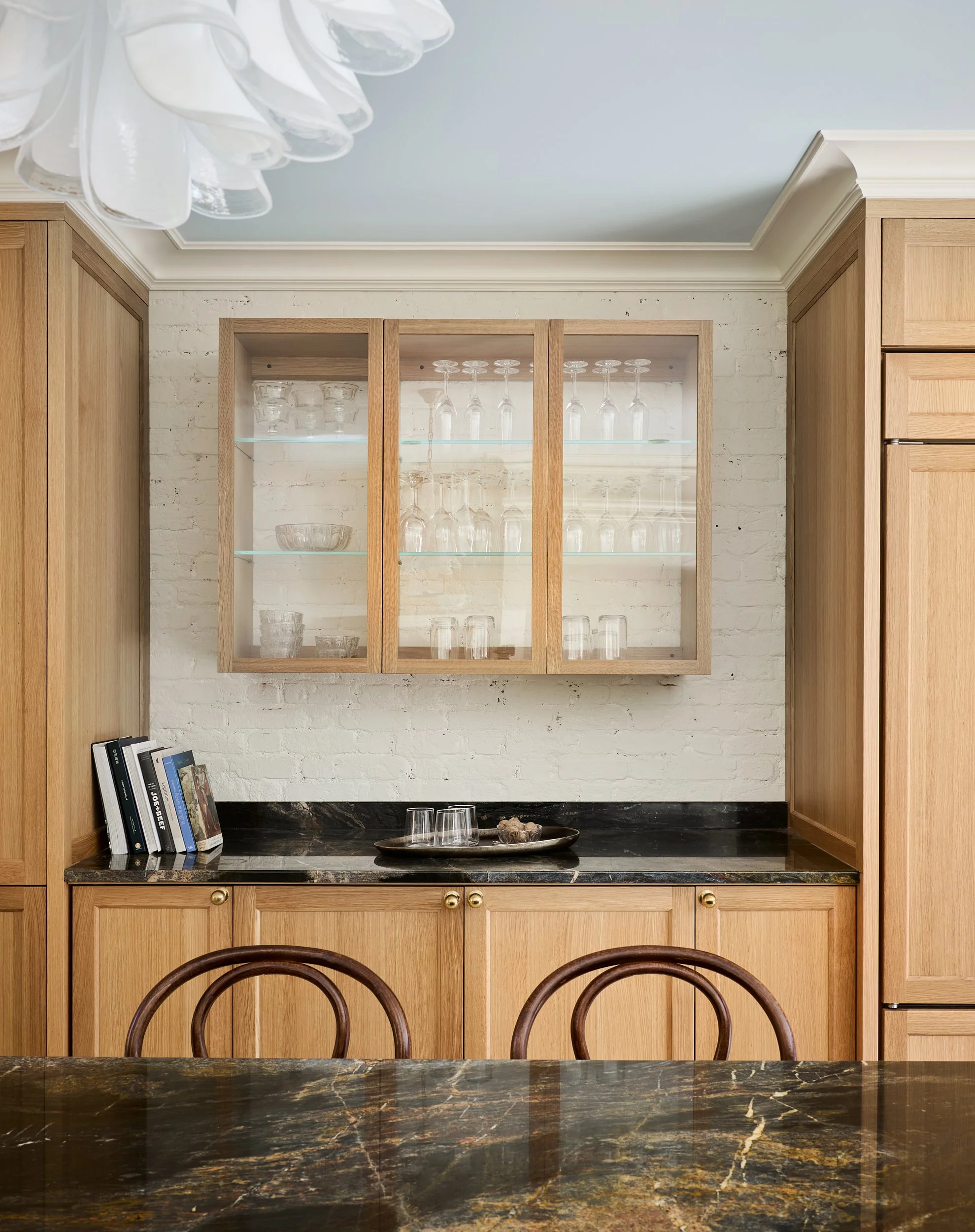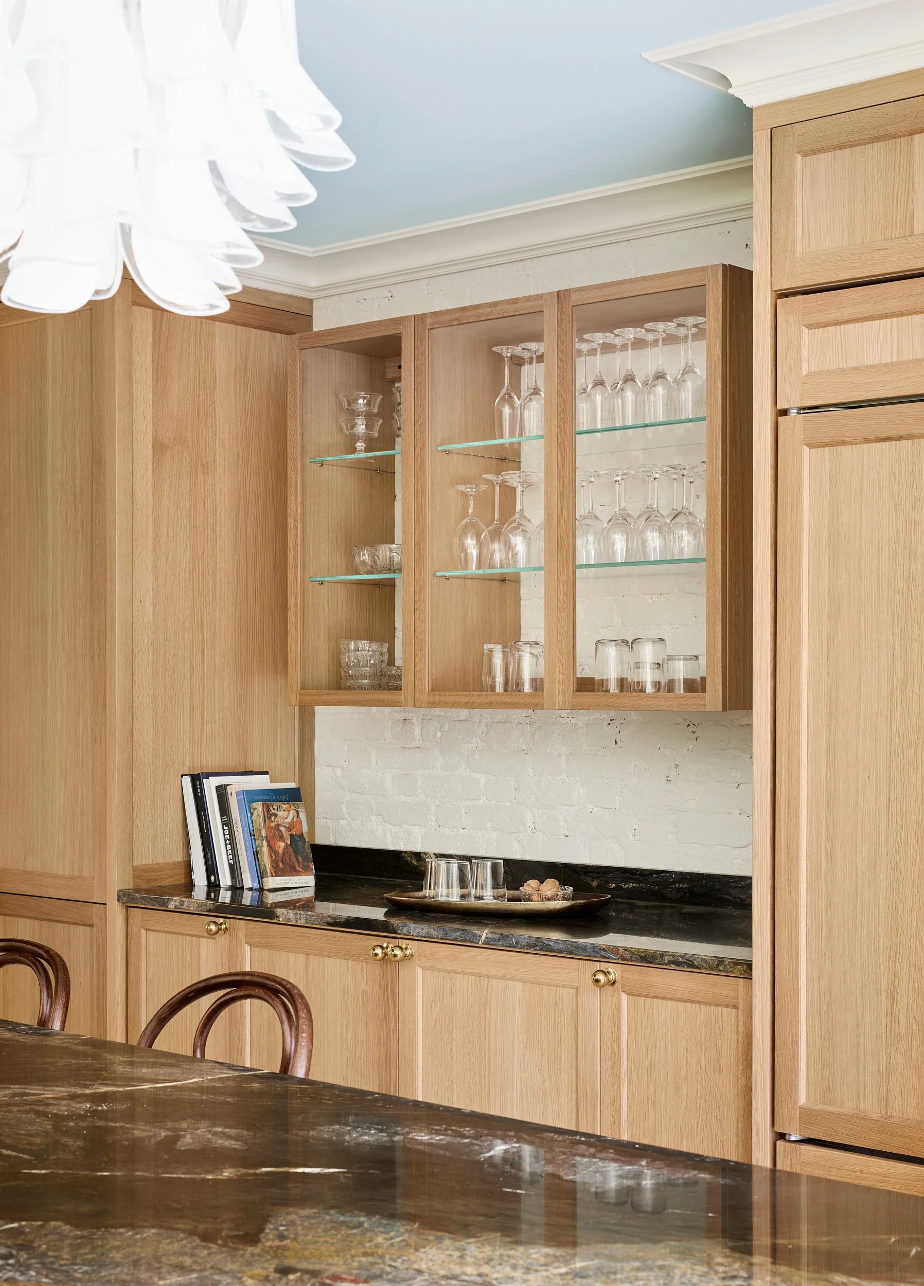 A refined mix of materials brings depth and character to the space: light and dark oak cabinetry, granite countertops, Élitis wallpaper, exposed brick, and a striking blue ceiling create a layered environment rich in contrast and warmth. The centrepiece, a custom-designed hood above a professional Bertazzoni gas range, anchors the composition, while Murano glass pendants add a touch of artistry and luminosity. Bathed in natural light, this kitchen harmonizes craft and innovation, enhancing the grandeur of the residence. It is a space where history and modernity coexist seamlessly.
